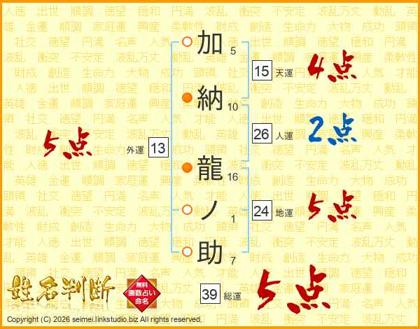 加(5画)納(10画) 龍(16画)ノ(1画)助(7画)