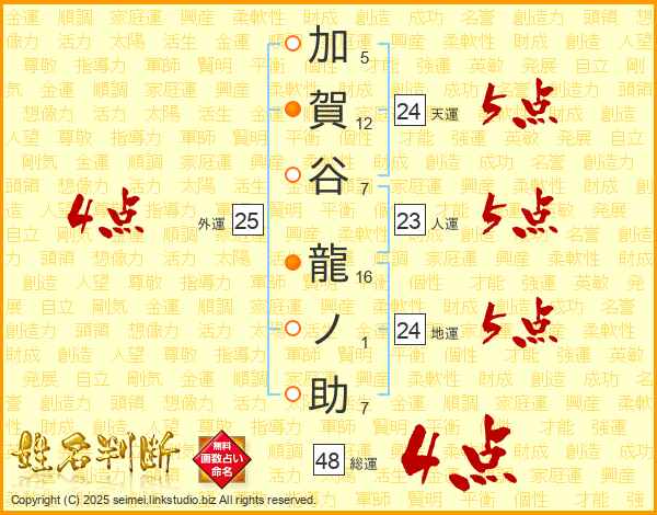 加(5画)賀(12画)谷(7画) 龍(16画)ノ(1画)助(7画)