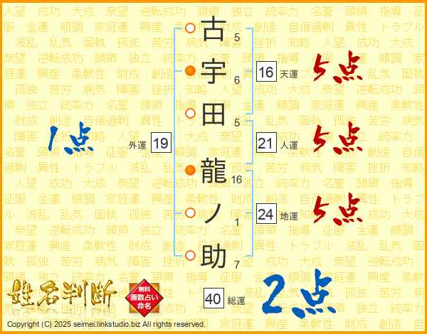 古(5画)宇(6画)田(5画) 龍(16画)ノ(1画)助(7画)