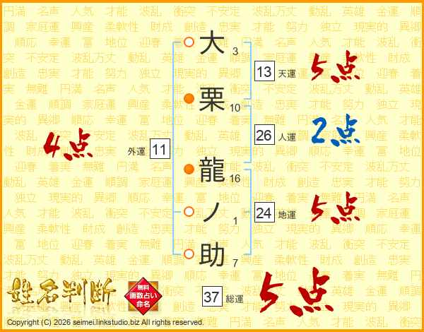 大(3画)栗(10画) 龍(16画)ノ(1画)助(7画)