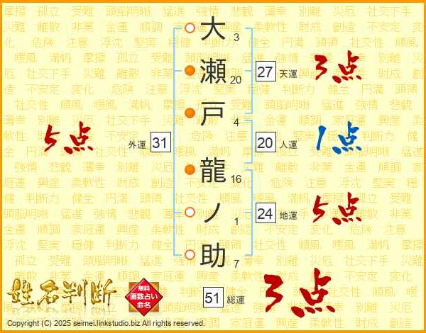 大瀬戸龍ノ助さんの総運は51画の3点!