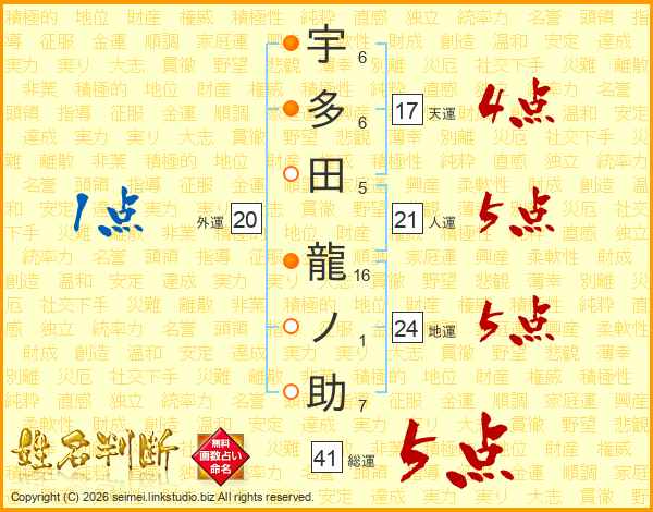 宇多田龍ノ助さんの総運は41画の5点!