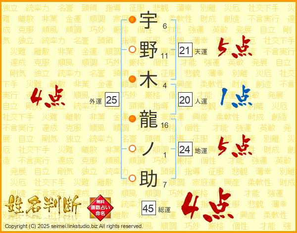宇(6画)野(11画)木(4画) 龍(16画)ノ(1画)助(7画)