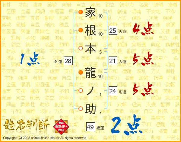 家(10画)根(10画)本(5画) 龍(16画)ノ(1画)助(7画)