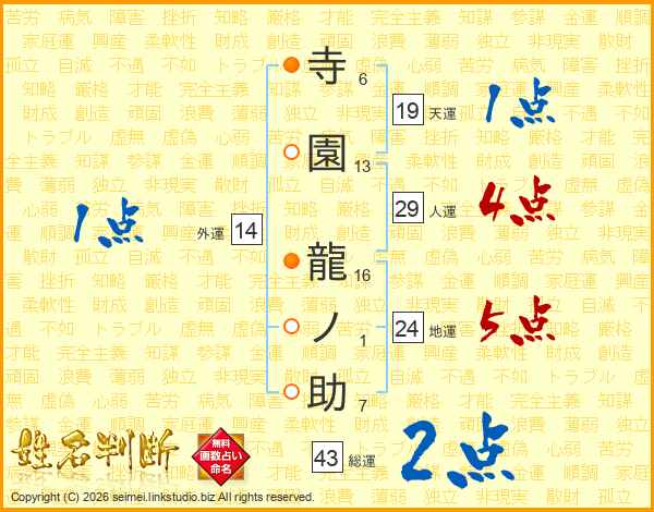 寺(6画)園(13画) 龍(16画)ノ(1画)助(7画)