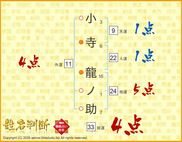 小寺龍ノ助さんの総運は33画の4点!