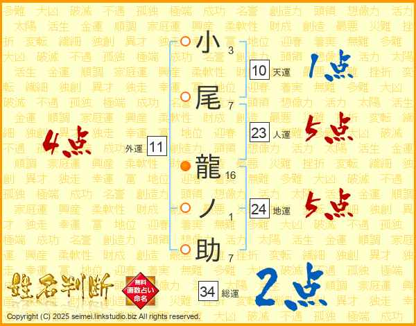 小(3画)尾(7画) 龍(16画)ノ(1画)助(7画)