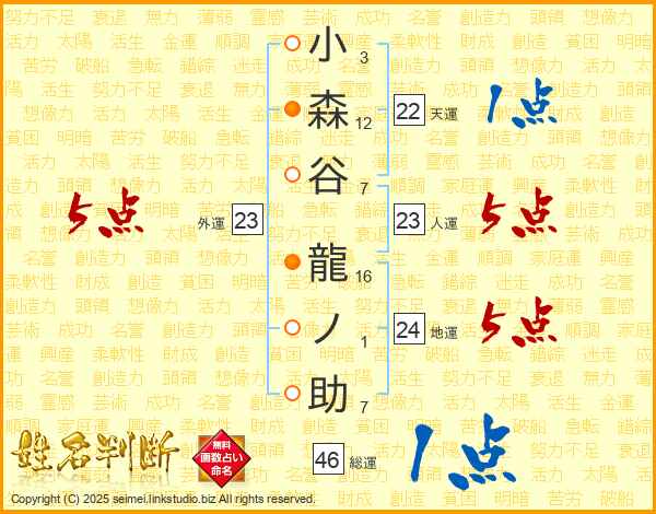 小(3画)森(12画)谷(7画) 龍(16画)ノ(1画)助(7画)