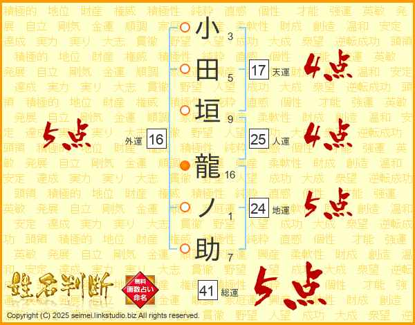 小田垣龍ノ助さんの総運は41画の5点!