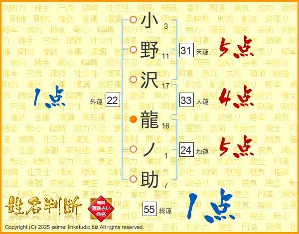 小(3画)野(11画)沢(17画) 龍(16画)ノ(1画)助(7画)