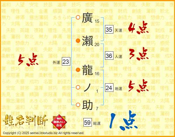 廣(15画)瀨(20画) 龍(16画)ノ(1画)助(7画)