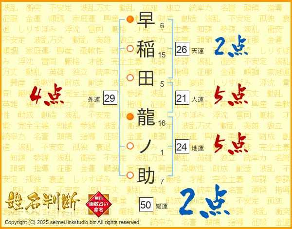 早(6画)稲(15画)田(5画) 龍(16画)ノ(1画)助(7画)