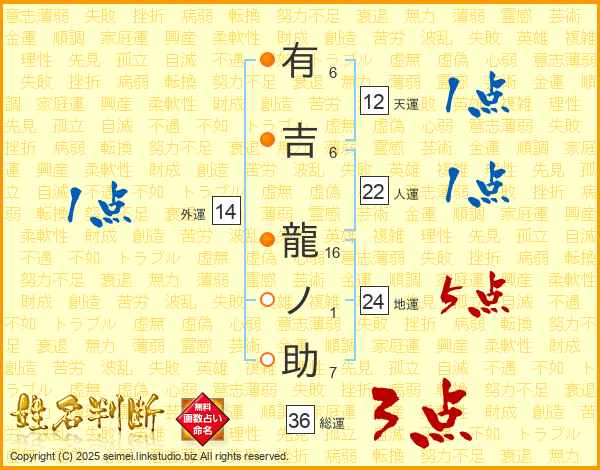 有(6画)吉(6画) 龍(16画)ノ(1画)助(7画)
