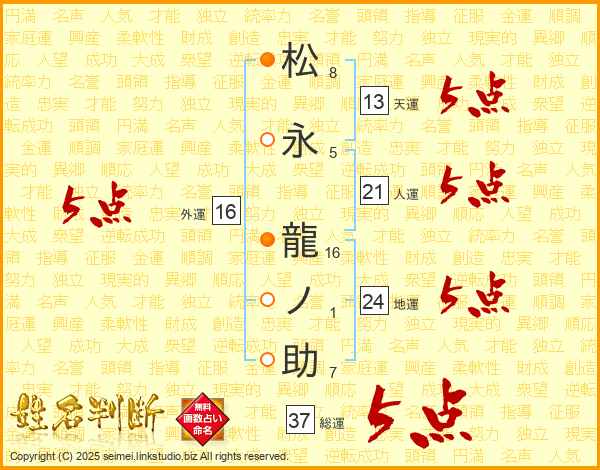 松永龍ノ助さんの総運は37画の5点!