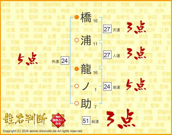 橋浦龍ノ助さんの総運は51画の3点!