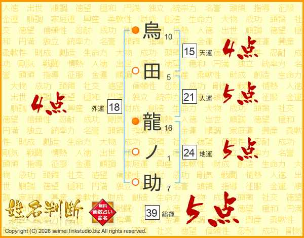 烏(10画)田(5画) 龍(16画)ノ(1画)助(7画)