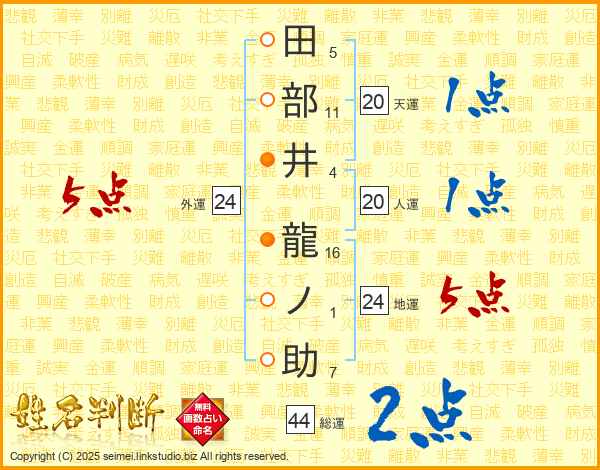 田(5画)部(11画)井(4画) 龍(16画)ノ(1画)助(7画)