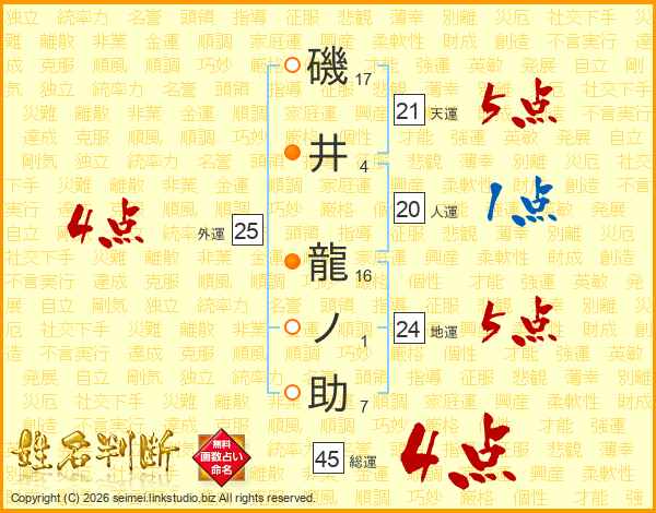 磯井龍ノ助さんの総運は45画の4点!