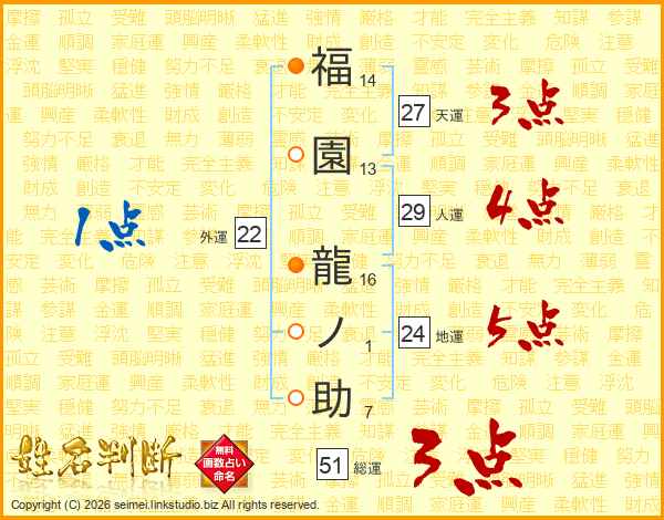 福(14画)園(13画) 龍(16画)ノ(1画)助(7画)