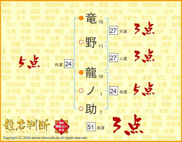 竜野龍ノ助さんの総運は51画の3点!