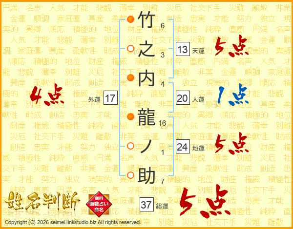 竹之内龍ノ助さんの総運は37画の5点!