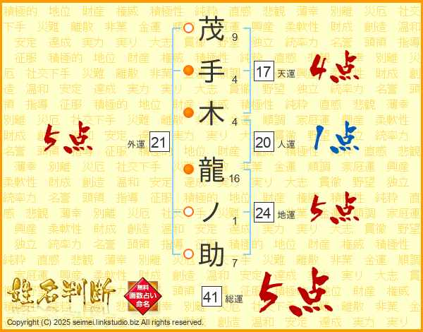 茂(9画)手(4画)木(4画) 龍(16画)ノ(1画)助(7画)