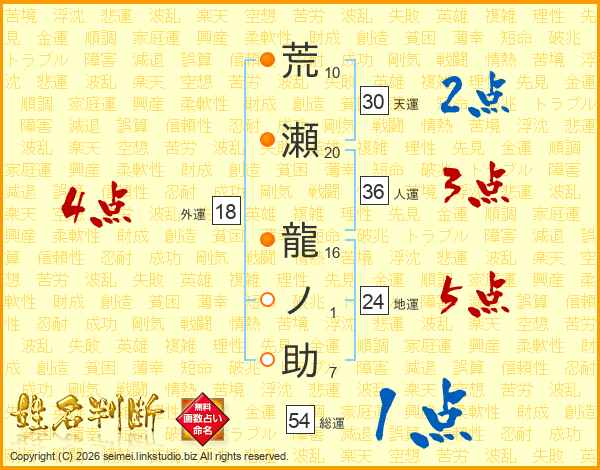 荒(10画)瀬(20画) 龍(16画)ノ(1画)助(7画)