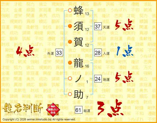 蜂須賀龍ノ助さんの外運は33画の4点!