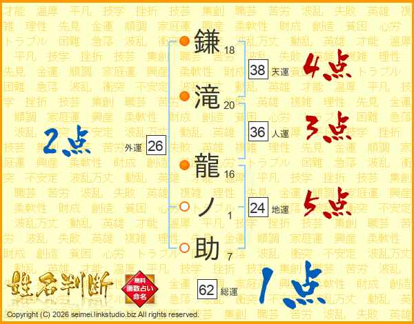 鎌(18画)滝(20画) 龍(16画)ノ(1画)助(7画)