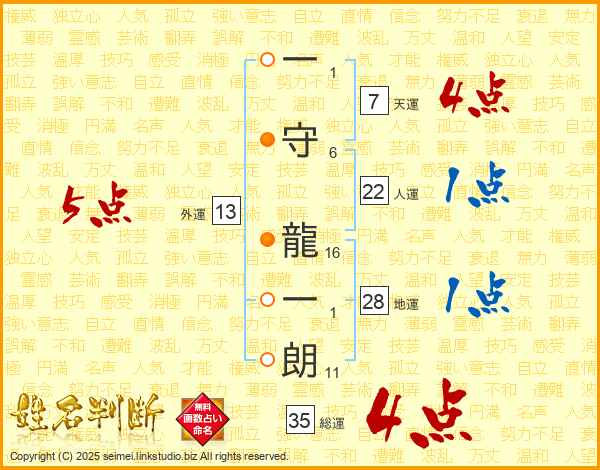 一(1画)守(6画) 龍(16画)一(1画)朗(11画)