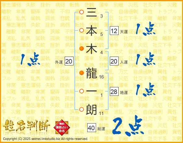 三(3画)本(5画)木(4画) 龍(16画)一(1画)朗(11画)