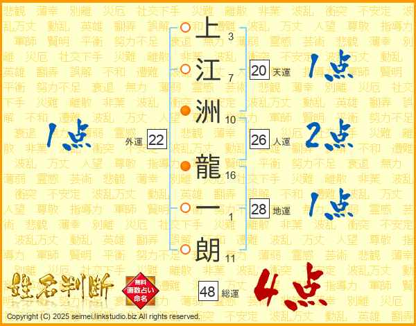 上(3画)江(7画)洲(10画) 龍(16画)一(1画)朗(11画)
