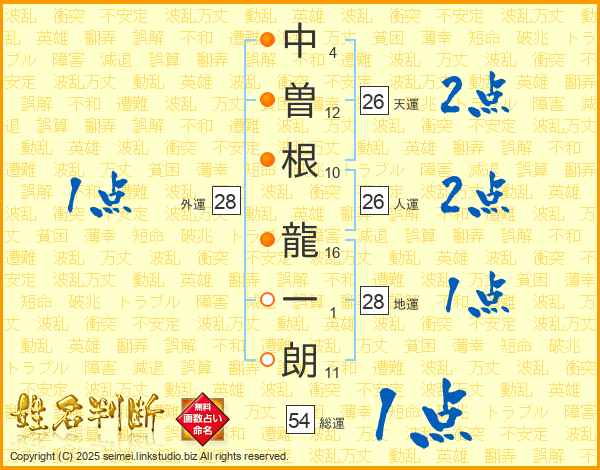 中(4画)曽(12画)根(10画) 龍(16画)一(1画)朗(11画)