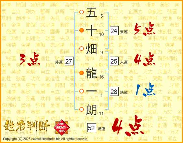五(5画)十(10画)畑(9画) 龍(16画)一(1画)朗(11画)