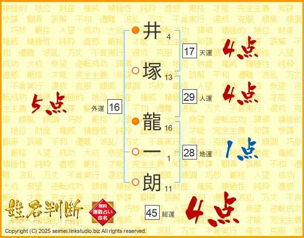 井(4画)塚(13画) 龍(16画)一(1画)朗(11画)