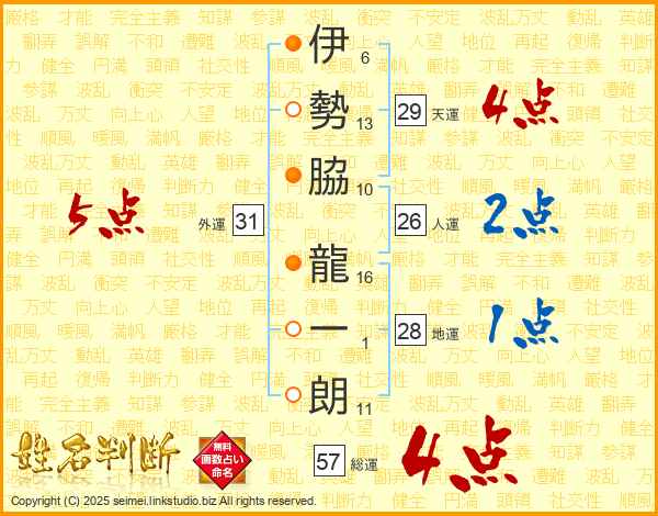 伊勢脇龍一朗さんの総運は57画の4点!