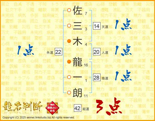 佐(7画)三(3画)木(4画) 龍(16画)一(1画)朗(11画)