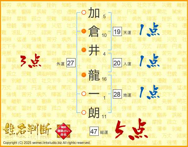 加(5画)倉(10画)井(4画) 龍(16画)一(1画)朗(11画)