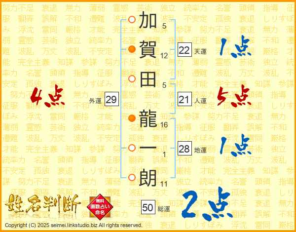 加(5画)賀(12画)田(5画) 龍(16画)一(1画)朗(11画)