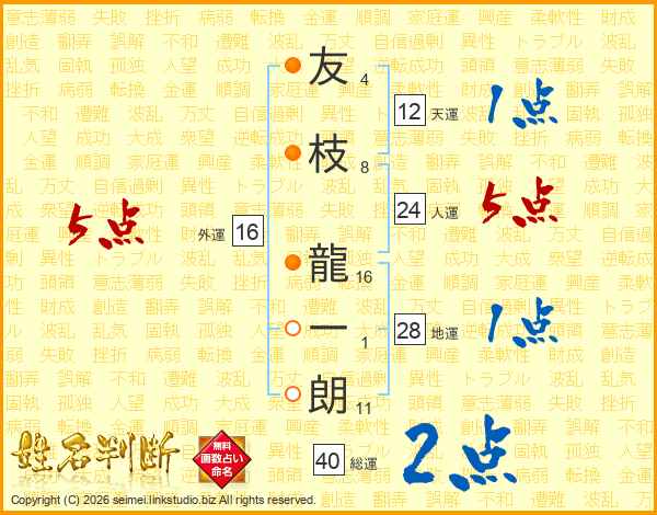 友(4画)枝(8画) 龍(16画)一(1画)朗(11画)