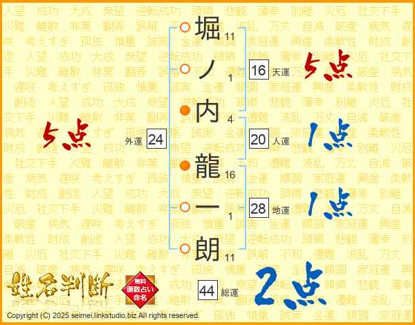堀(11画)ノ(1画)内(4画) 龍(16画)一(1画)朗(11画)