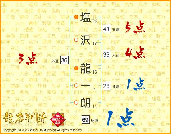塩(24画)沢(17画) 龍(16画)一(1画)朗(11画)