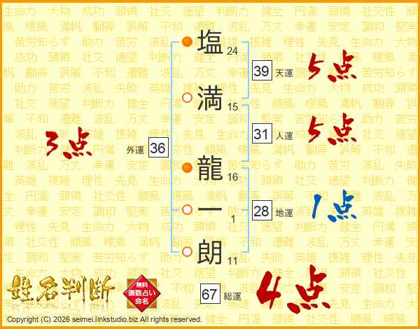 塩(24画)満(15画) 龍(16画)一(1画)朗(11画)