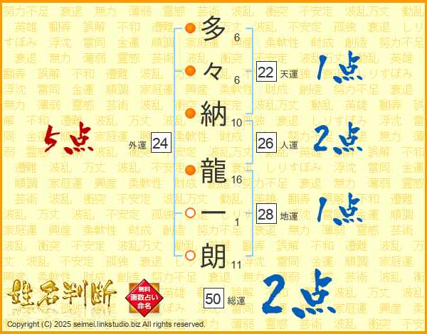 多(6画)々(6画)納(10画) 龍(16画)一(1画)朗(11画)