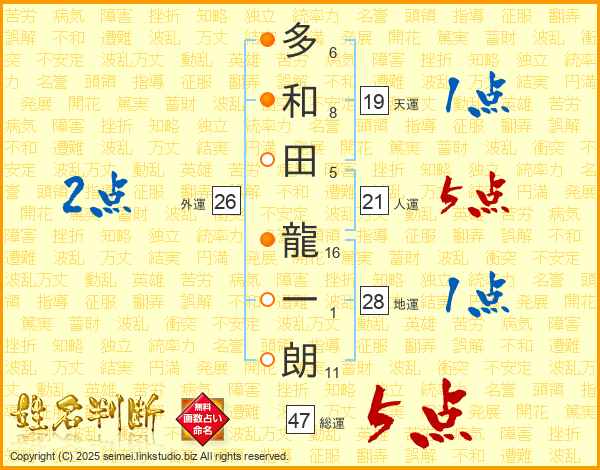 多(6画)和(8画)田(5画) 龍(16画)一(1画)朗(11画)