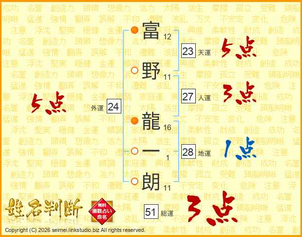 富(12画)野(11画) 龍(16画)一(1画)朗(11画)