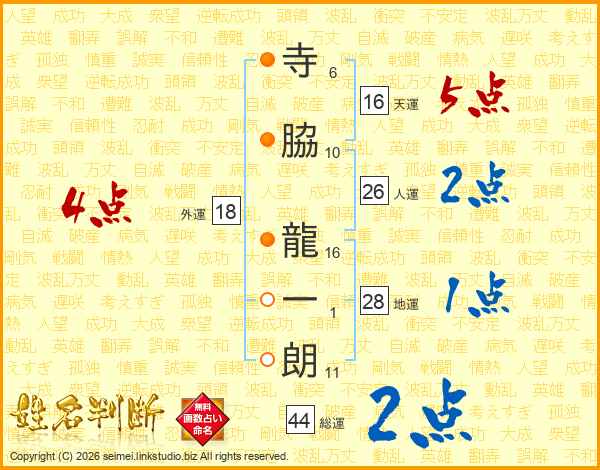 寺(6画)脇(10画) 龍(16画)一(1画)朗(11画)