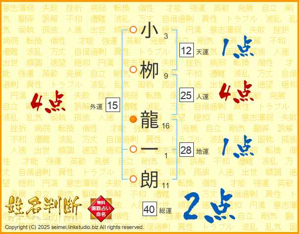 小(3画)栁(9画) 龍(16画)一(1画)朗(11画)
