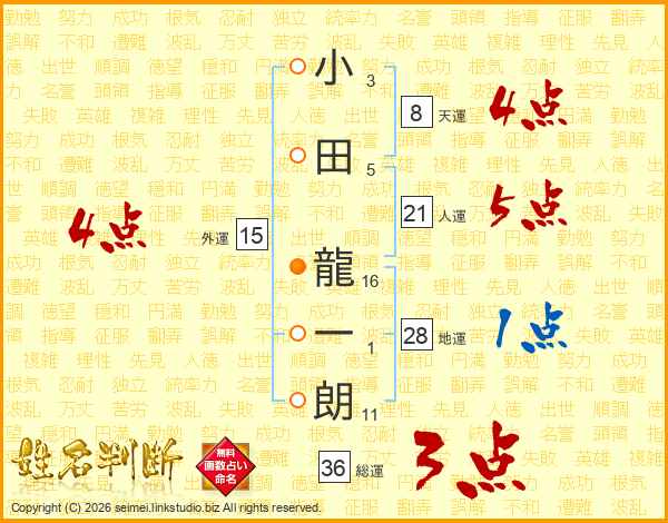 小田龍一朗さんの総運は36画の3点!