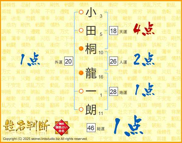 小(3画)田(5画)桐(10画) 龍(16画)一(1画)朗(11画)